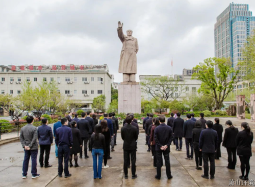 在毛主席纪念像前,全体职员静默肃立、三鞠躬表达对伟人首脑毛主席的高尚敬意和深切吊祭,瞻仰伟人英容,追忆伟人事迹,重温入党誓词。