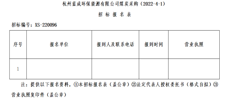 ¶þ¡¢ÕбêÏîÄ¿£ºº¼ÖÝÀ¶³É»·±£ÄÜÔ´ÓÐÏÞ¹«Ë¾ÃºÌ¿²É¹º(2022-4-1)¡£
