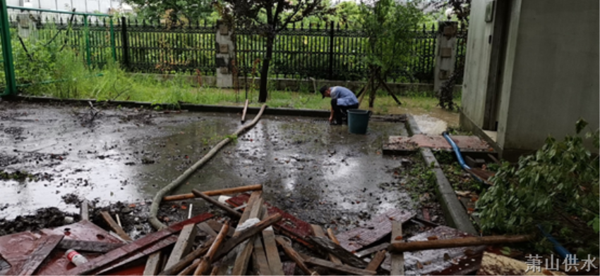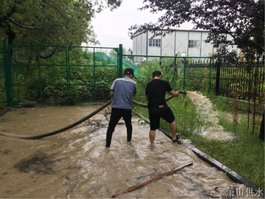 事情服湿了,就换回自己的衣服,然而自己的衣服也是坚持不了多久。在取水的路上,我发明出厂水水房门前的逍遥积水严重,下水口梗塞,在微信群里反应了之后,同事们立马赶来解决。不到二十分钟,积水问题就迎刃而解。瓢泼大雨中的争分夺秒,是对事情的认真,更是对黎民的允许。