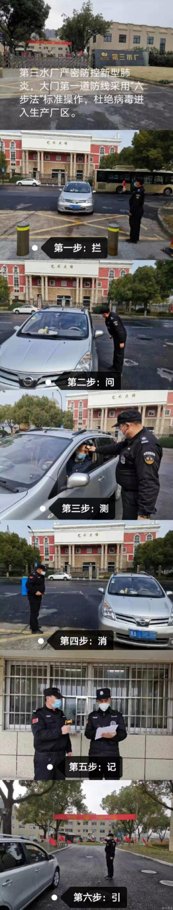 公司下属各水厂对收支职员、车辆举行严酷管控,接纳拦、问、测、消、记、引的“六步法”标准操作,杜绝任何可疑职员进入厂区。