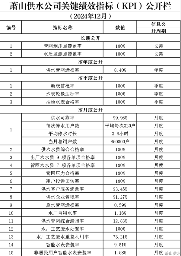微彩网供水公司要害绩效指标(KPI)果真栏(2024年12月)