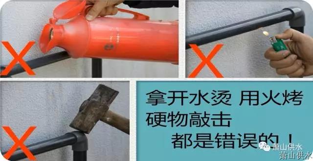 Áù¡¢¶ÔÒѶ³×¡µÄË®¹Ü¡¢·§ÃÅ¡¢Ë®ÁúÍ·ÇмÉÇ¿ÐпªÆô£¬ÒËÏÈÓÃÈÈë½í°ü¹ü£¬È»ºó½½ÎÂˮš¿ªË®ÁúÍ·£¬ÓÃÎÂË®ÑØË®ÁúÍ·Öð²½ÏòË®¹Ü½½È÷£¬Ê¹Ë®¹Ü½â¶³¡£Èô½½ÖÁË®±í´¦ÈÔ²»¼ûÓÐË®Á÷³ö£¬Ôò˵Ã÷Ë®±íÒ²¶³×¡ÁË£¬´ËʱÔÚË®±íÉϰüÉÏÈÈë½íÓò»¸ßÓÚ30¶ÈµÄÎÂË®£¬Ê¹Ë®±í½â¶³£¬ÇмÉÓÃ»ðºæ¿¾ÒÔÃâËð»µÓÃË®ÉèÊ©¡£