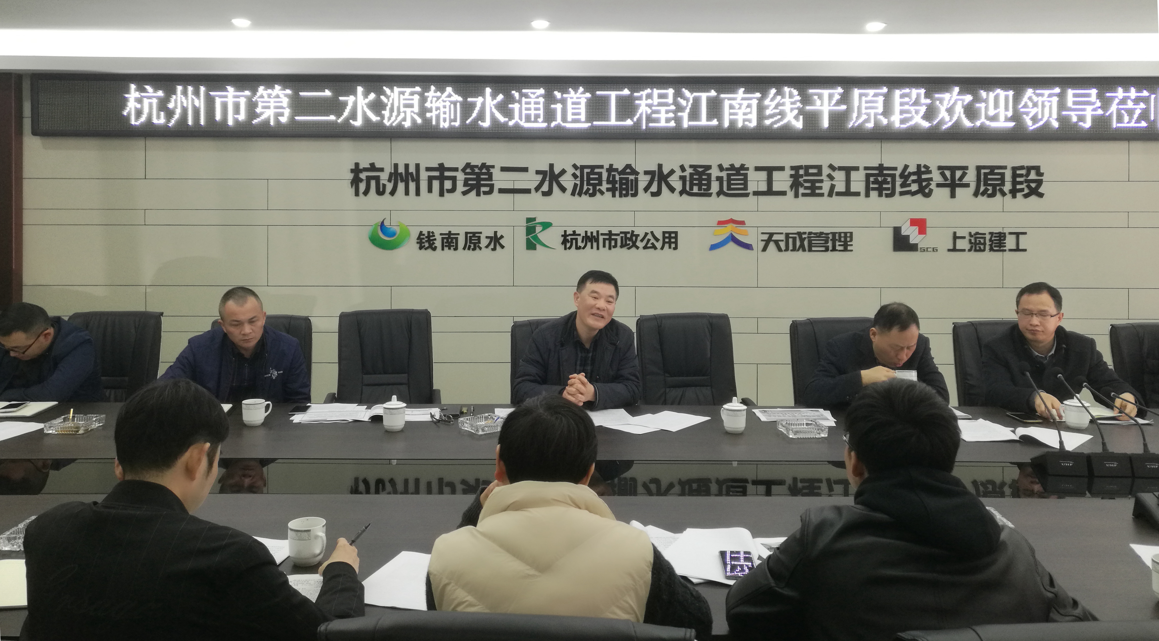 2019年3月12日上午,杭州钱南原水有限公司董事长胡妙生到江南线现场调研召开项目专题推进会,钱南公司副司理余国军、代建单位副总司理柯鹤新陪同调研,江南线山岭段清静原段的施工单位和监理单位加入聚会 。