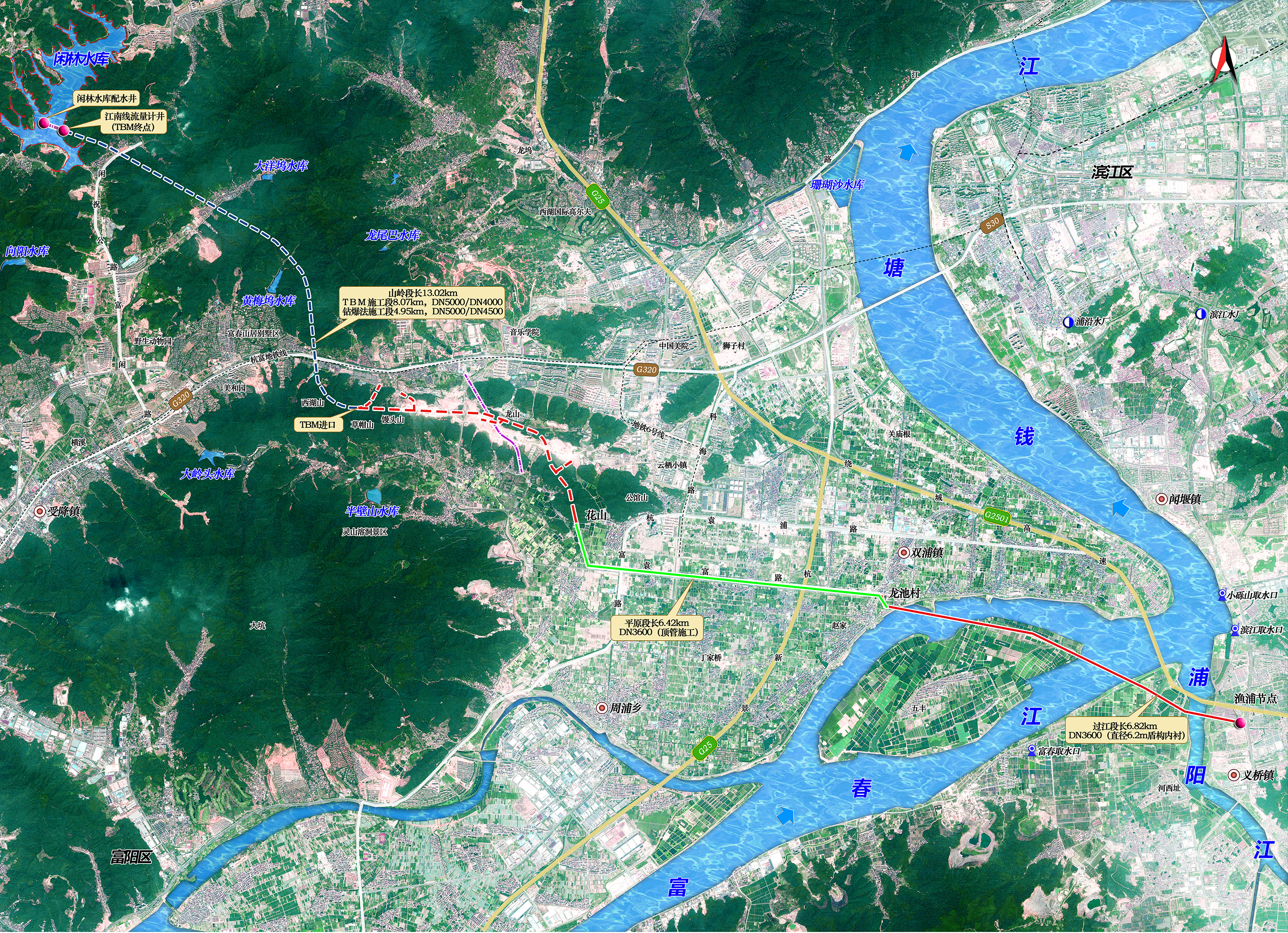 工程自余杭闲林水库配水井最先,新建输水隧洞和管道,途经余杭、西湖、富阳、微彩网四个行政区,最后至微彩网渔浦节点,总长26公里,总投资约30亿元,全线3个标段分段开工建设,划分为山岭段、平原段和过江段。