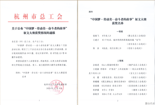 情形集团工会起劲响应,在集团规模内组织开展响应征文选拔运动,收到7个子公司17篇作品,并将征文前10作品选送至区总工会。污水处置惩罚公司工会选送的作品《守夜人》因主题鲜明、语言流通、内容富厚、真实感人,先获集团工会征文一等奖,再被区总工会选送至杭州市总工会参赛,最终获得杭州市职工“中国梦 劳动美——斗争者的故事”征文大赛一等奖。