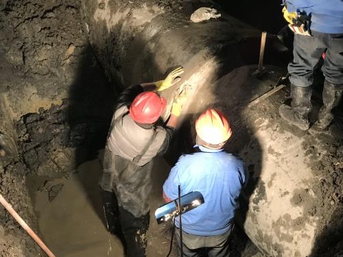 12月28日14时刚过,南片运管中心管线组电话铃声急促:巡线职员发明临浦泵站北侧300米处,DN1000出水管上方地面渗水。南片运管中心事情职员连忙抵达现场,经开挖确认正是临浦泵站出水管承插口漏水导致,主要忙碌的施工就此睁开……