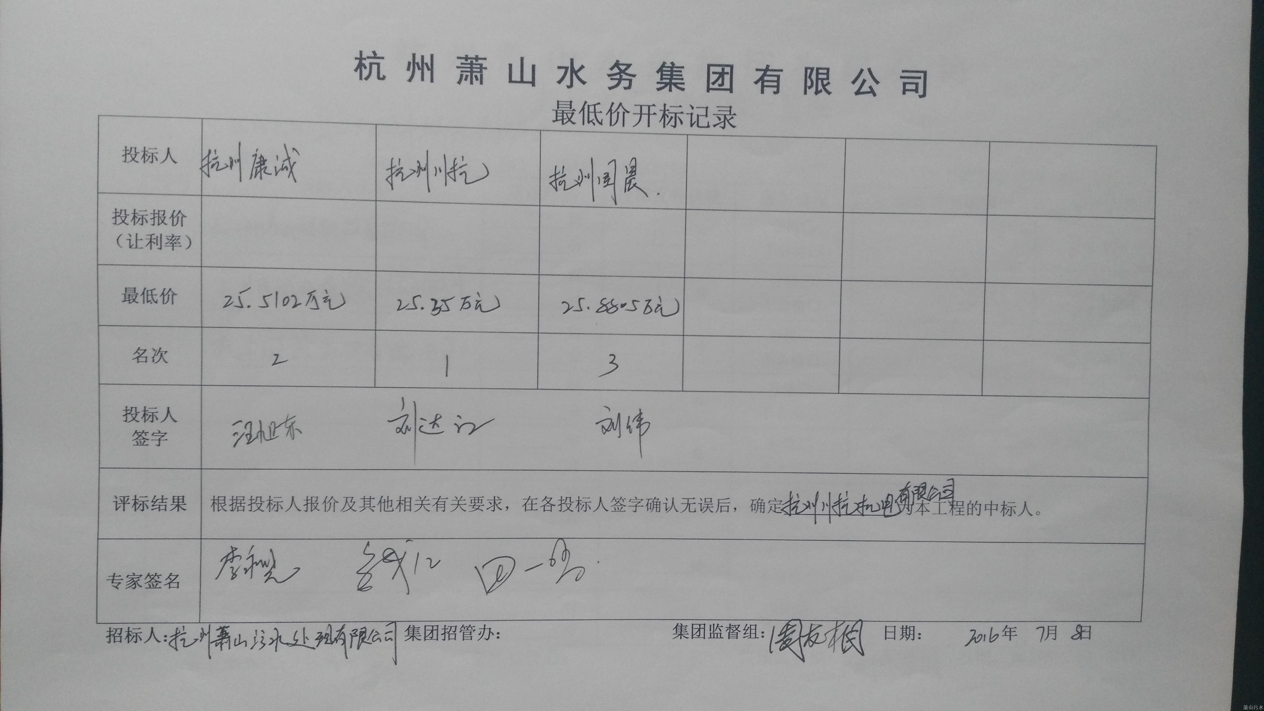 凭证集团小型项目(物资)招标有关划定于2016年7月8日10:00时,在水务大厦B座27楼聚会室,组织了污水公司所属微彩网临江污水厂飞力NP3202水泵蜗壳替换刷新采购项目的开标运动,经评标专家评审,现将效果公示如下: 一、 中标效果: 中标单位:杭州川杭机电有限公司 投标价:25.35万元 二、 评标委员:田一鸣 钱江 李永晓 三、投诉电话: 82734882 杭州微彩网污水处置惩罚有限公司 2016年7月11日 |
